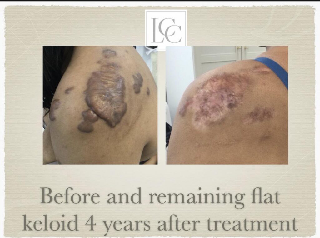 👉 Pulse dye laser treatment for keloids to reduce redness and vascularity.